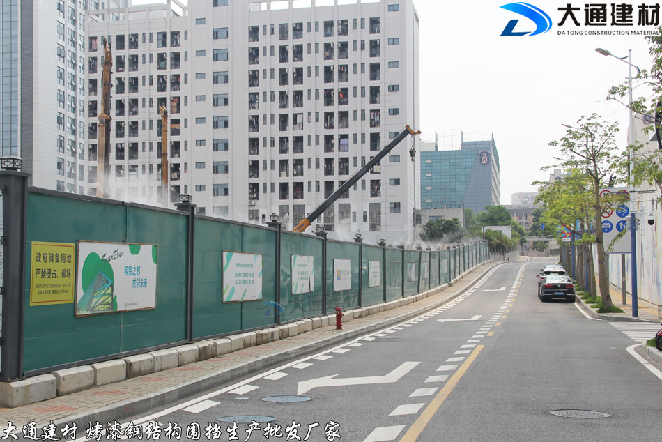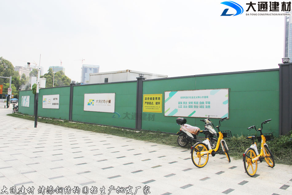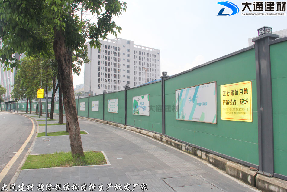 深圳市大通建材推出新型圍擋-綠色烤漆鋼結構圍擋A款,其中的綠色烤漆墻面是一種看起來非常舒服、很有活力的顏色,簡潔大方、美觀環保 抗風力強、安全穩固,適合各種施工工程選用。