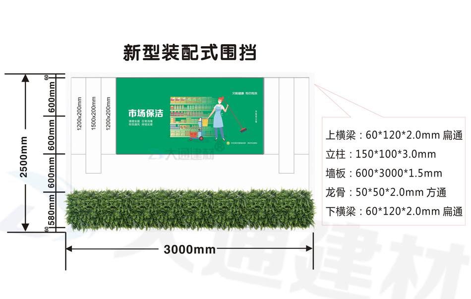 為提升城市建設工程工地標準化、精細化管理水平,使圍擋成為城市美麗風景線的重要組成部分。傳統型圍擋已開始逐步淘汰,根據市場動態及客戶需求,開發生產的新一代裝配式圍擋,一經投入市場,廣受客戶好評。大通新型裝配式圍擋采用全隱藏式立柱、白色烤漆擋板、加上底部配防真綠植,外觀更加美觀、大氣,提高施工現場整體環境及企業形象。大通新型裝配式圍擋的鋼結構立柱用的是150*100型材,生產更統一、加工更方便,能快速安裝,標準化拼裝,安裝后更牢固、更能抗臺風。