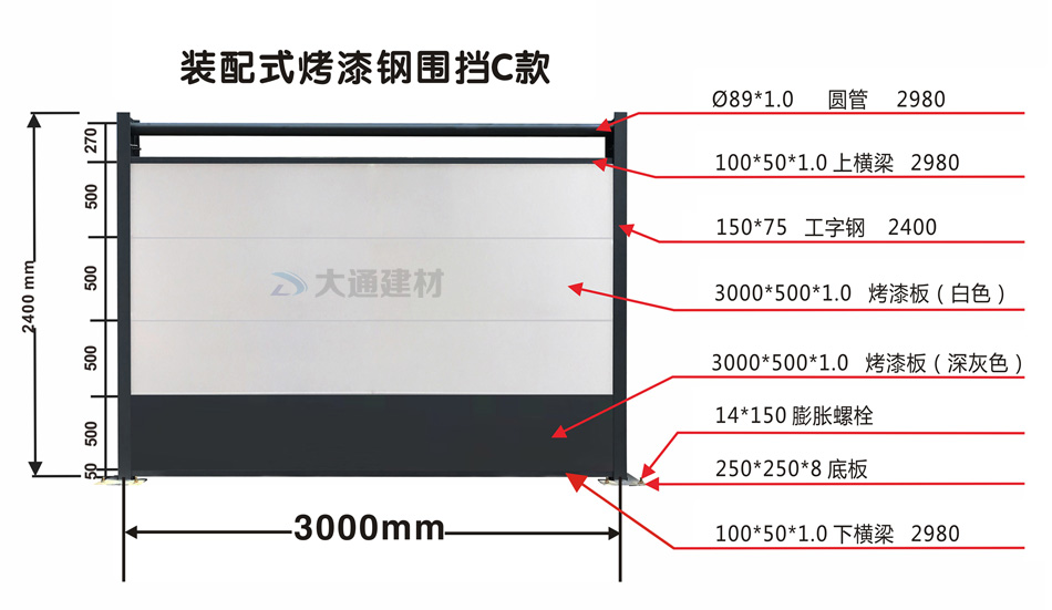 本文關(guān)鍵詞: C類鋼結(jié)構(gòu)烤漆板圍擋,鋼結(jié)構(gòu)圍擋,圍擋,大通建材,C類烤漆板圍擋,裝配式圍擋